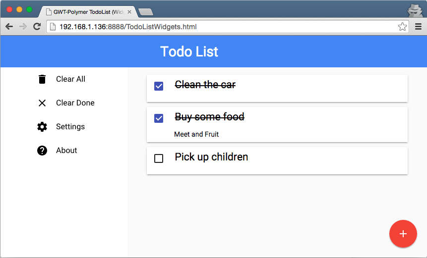 @UiHandler("menuClearAll") protected void menuClearAll(ClickEvent e) { closeMenu(); content.clear(); } @UiHandler("menuClearDone") protected void menuClearDone(ClickEvent e) { closeMenu(); for (int i = content.getWidgetCount() - 1; i > -1; i--) { Item item = (Item)content.getWidget(i); if (item.isDone()) { content.remove(item); } } } private void closeMenu() { if (drawerPanel.getNarrow()) { drawerPanel.closeDrawer(); } }Note: The closeMenu() method is only useful if the application is viewed on a mobile device, or if your browser window is narrow enough for the side menu to collapse. Hence, we use this method to hide the menu after clicking on any menu item.